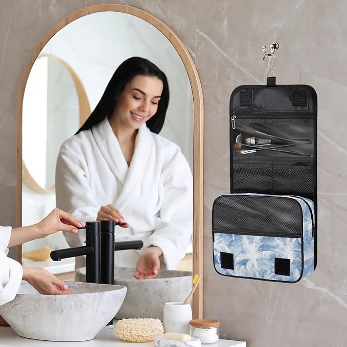 Vintage Blue Palm Hanging Travel Toiletry Kit Bag with Hook for Men and Boys, Beach Tropical Tree Makeup Case Waterproof Cosmetic Bag Storage Bag Organizer for Accessories Toiletries