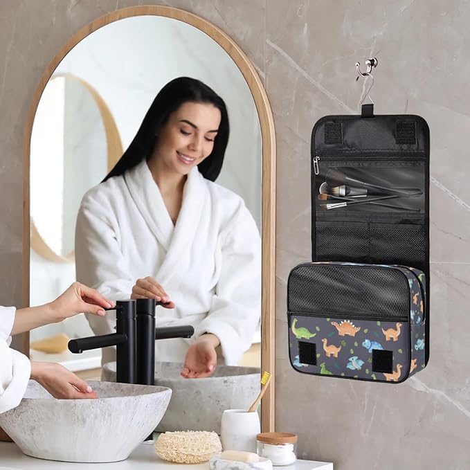 Cute Dinosaur Hanging Travel Toiletry Kit Bag with Hook for Men and Boys, Cartoon Dino Makeup Case Waterproof Cosmetic Bag Storage Bag Organizer for Accessories Toiletries