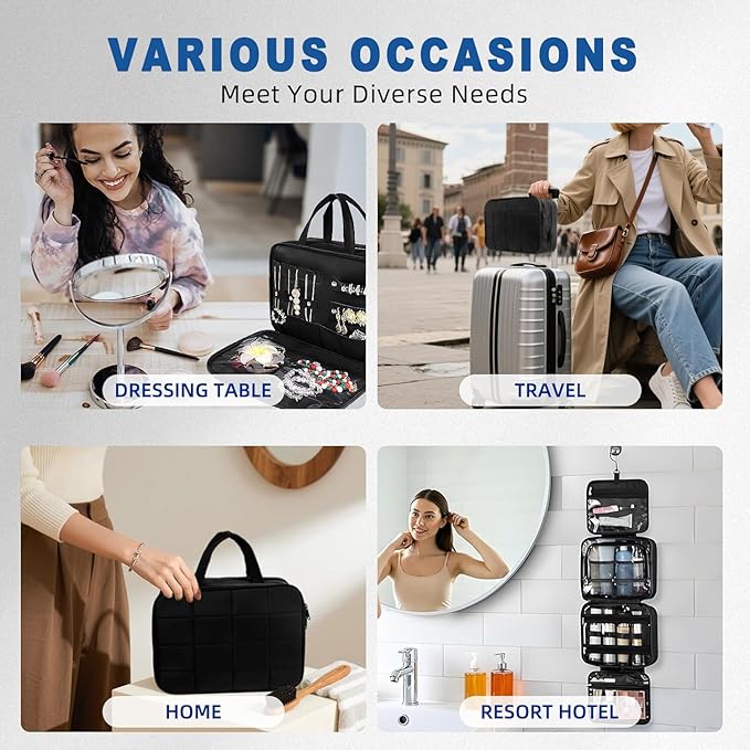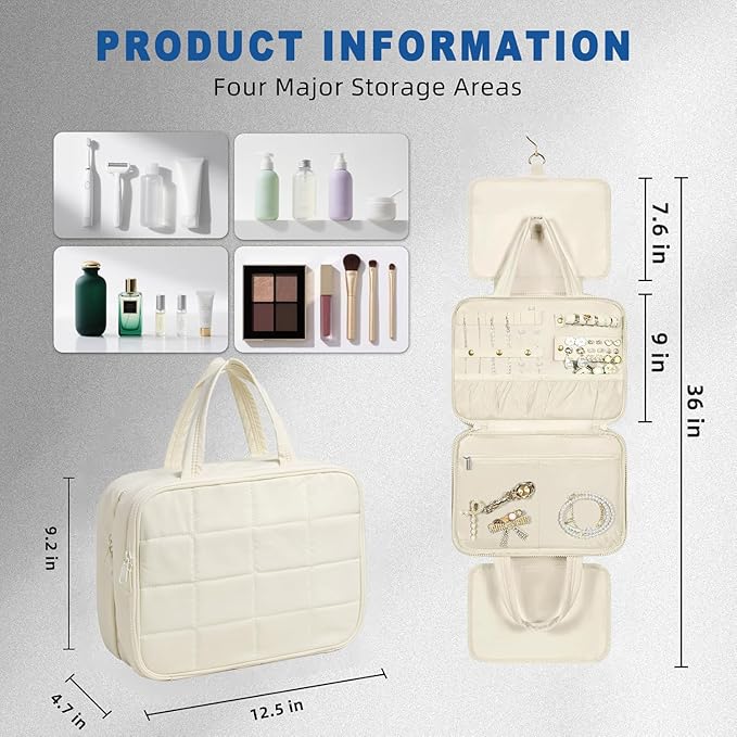 - GREAT ORGANIZER MASTER - This wash bag is designed with toiletry storage compartments and a special jewelry compartment; you can easily put your wash products and jewelry separately to make your journey organized. The size of the fully-loaded state is .''12.5L x 9.2''H x 4.7'W, the main compartments can hold up to toiletries and cosmetics at the same time, no worries for long-distance travel.