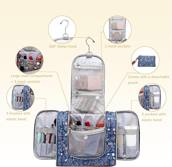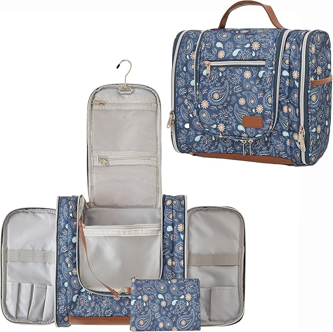 Hanging Toiletry Bag for Women, Travel Makeup with Metal Swivel Hook, Organizer for Full Sized Cosmetics and Toiletries,Water-Resistant Nylon,Paisley Floral